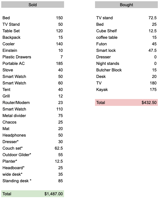 The items on the list with an asterisk are things I sold and only show half the value for me because the other half went to Leslie. Similarly, everything in the buy section is half the actual price because we split the cost.